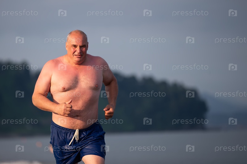 Пожилой мужчина спортивного телосложения совершает пробежку вдоль берега моря. Мужчина занимается спортом
