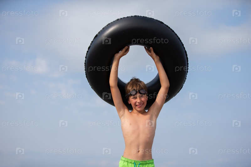 Счастливый мальчик в плавательных очках и с надувным спасательным кругом