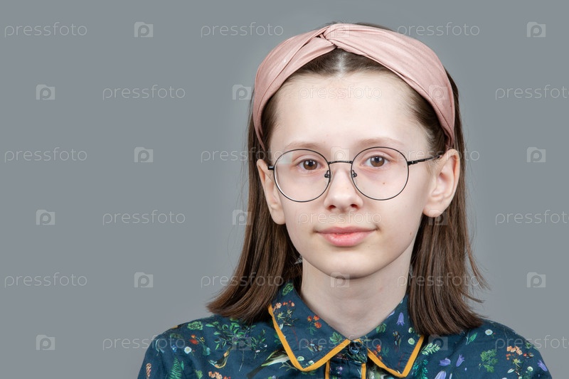 Забавная девушка-ботаник в очках с умным видом смотрит в камеру