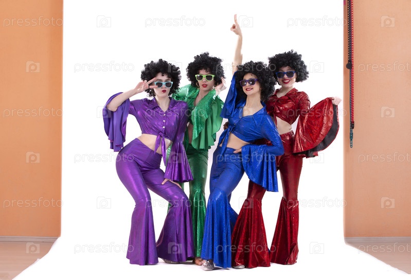 Группа девушек в ярких расклешенных костюмах и афро-париках позируют в фотостудии. Стиль диско восьмидесятых или семидесятых