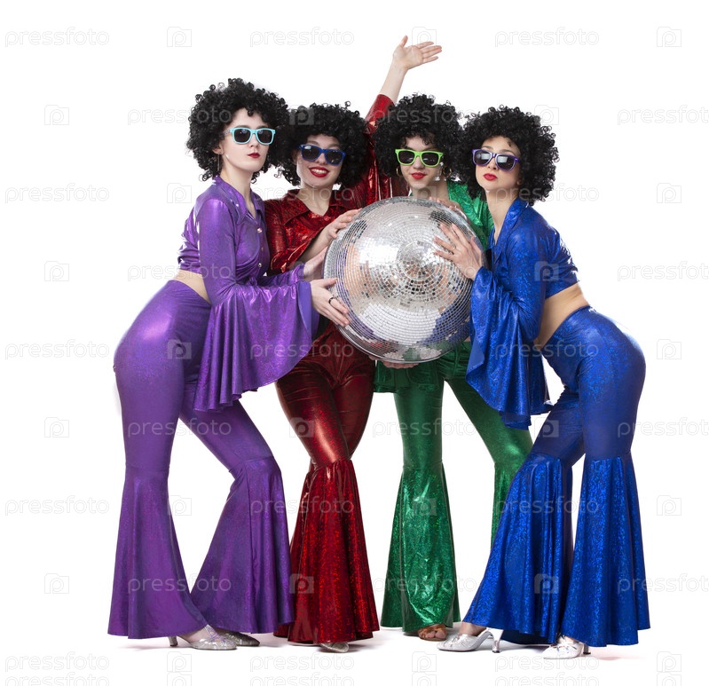 Группа девушек в диско-костюмах держат диско-шар и смотрят в камеру
