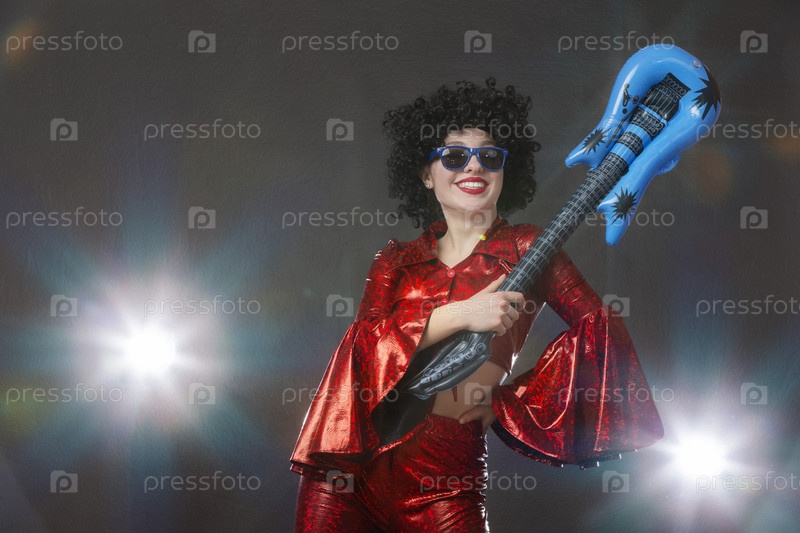 Забавный поп-певец с игрушечной гитарой на сером фоне