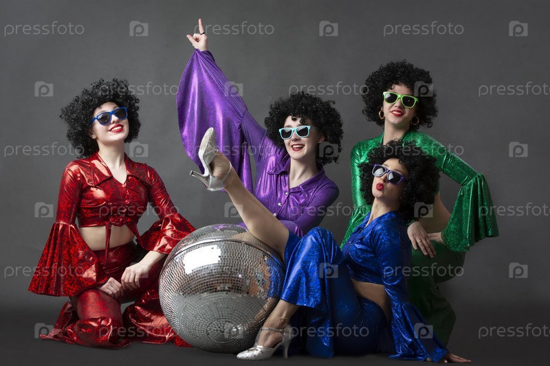 Группа девушек в париках с диско-шаром и красочных костюмах позируют на сером фоне. Диско-вечеринка