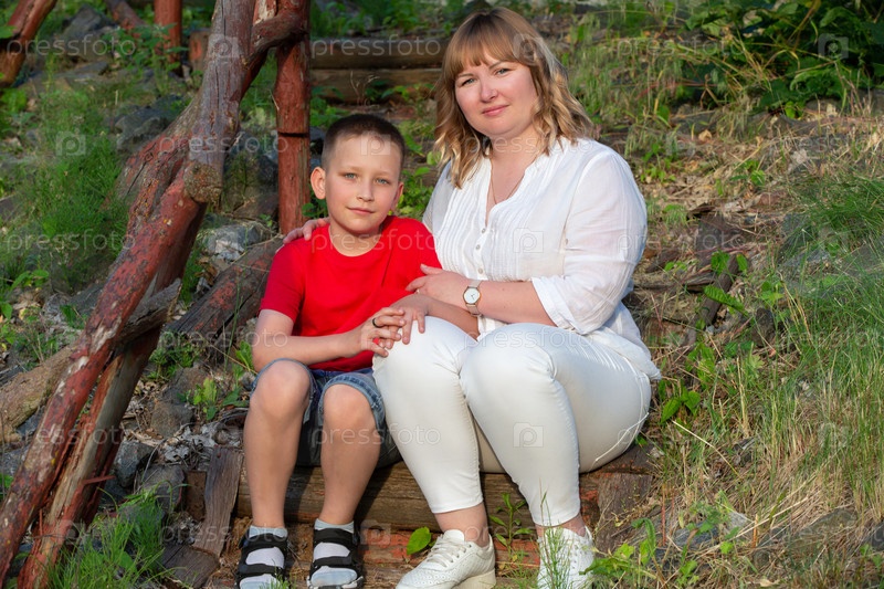 Счастливые мама и сын на летней прогулке сидят на деревянной скамейке, смотрят в камеру