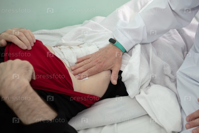 Врач ощупывает живот пациента после операции
