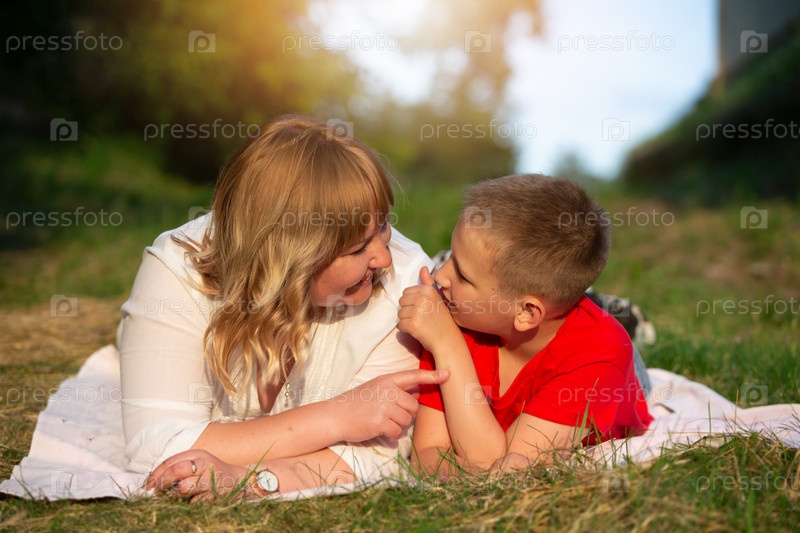 Счастливые мама и сын на летнем пикнике общаются, проводят время вместе, лежат на траве. День матери