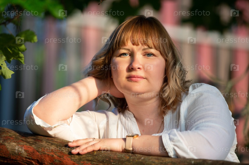Красивая блондинка с полным лицом и голубыми глазами смотрит в камеру