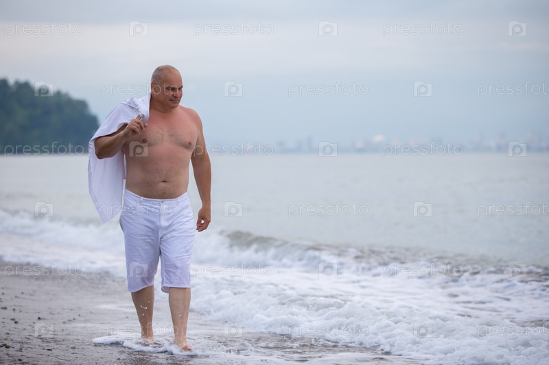 Пожилой красивый мужчина спортивного телосложения прогуливается вдоль побережья
