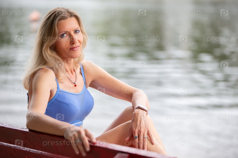 Зрелая женщина в купальнике загорает на пляже