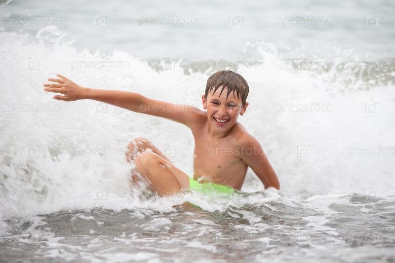Веселый счастливый ребенок играет с морскими волнами, улыбается