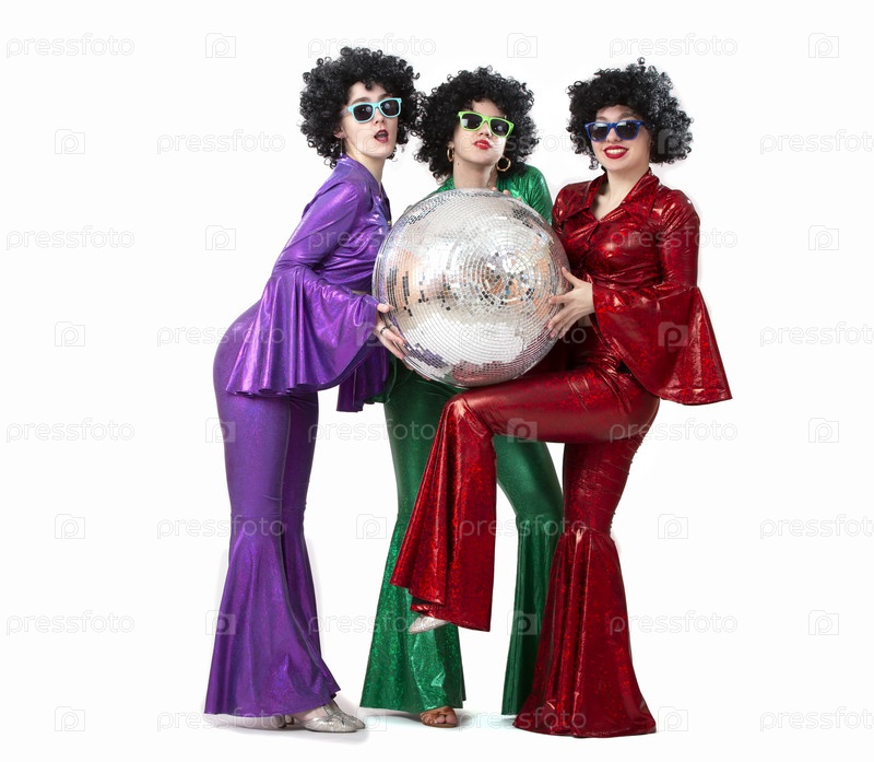 Группа девушек с диско-шаром в красочных костюмах в стиле моды семидесятых или восьмидесятых годов. Диско-вечеринка на белом фоне