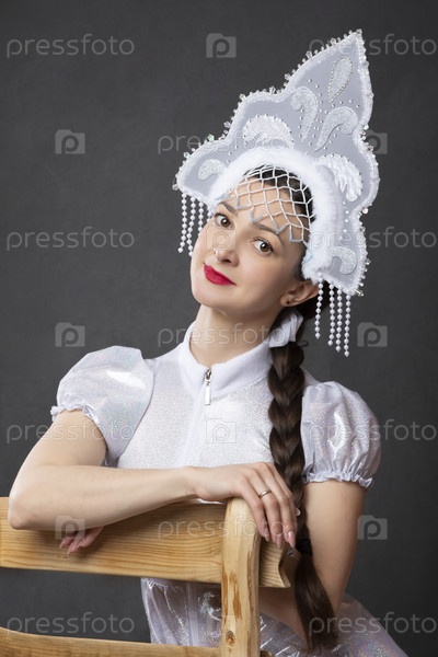 Портрет красивой девушки в костюме снегурочки на сером фоне. Русская снегурочка в короне сидит на деревянном стуле
