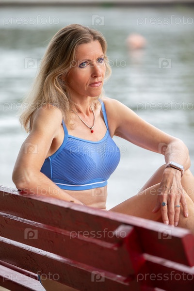 Зрелая женщина в купальнике загорает на пляже