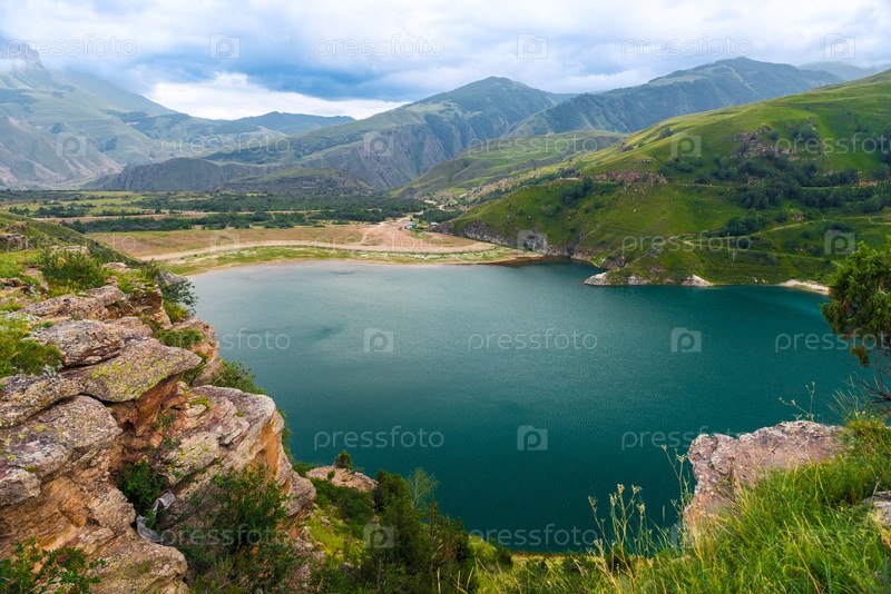 Живописный вид на горное озеро Гижгит с лазурной водой. Кавказ