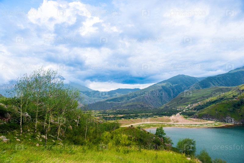 Живописный вид на горное озеро Гижгит с лазурной водой. Кавказ