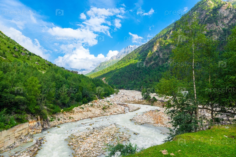 Живописный горный пейзаж бурной горной реки и ее долины среди зеленых гор. Кавказ, Приэльбрусье