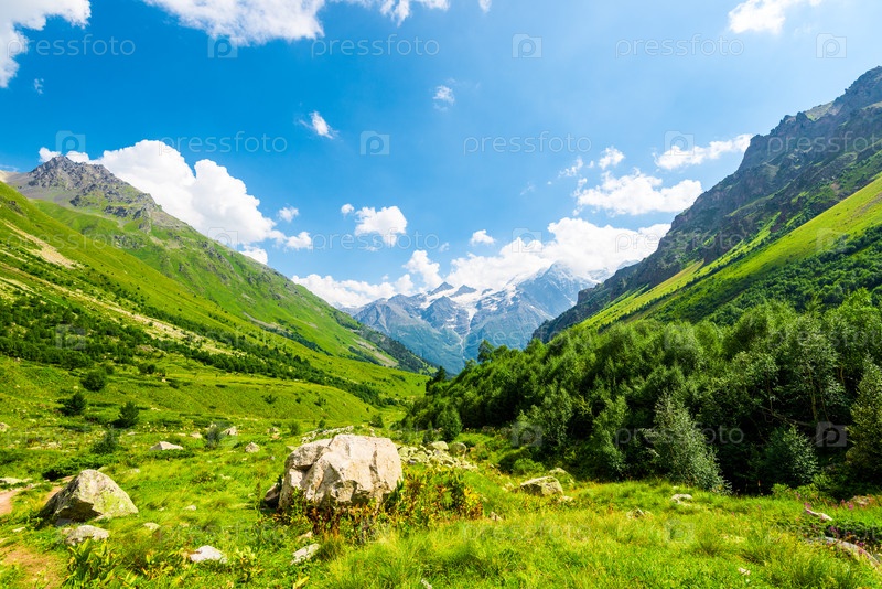 Красивый высокогорный пейзаж с зелеными склонами и большими камнями. Кавказ, Приэльбрусье