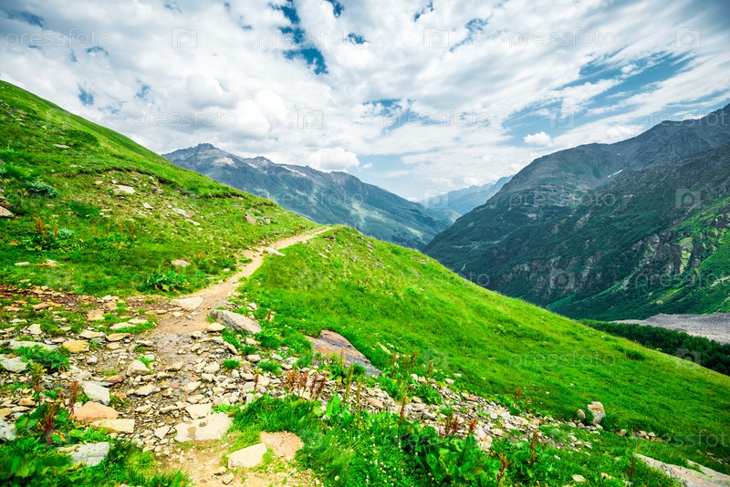 Красивый вид с пешеходной тропы на склоне горы высоко в Кавказских горах