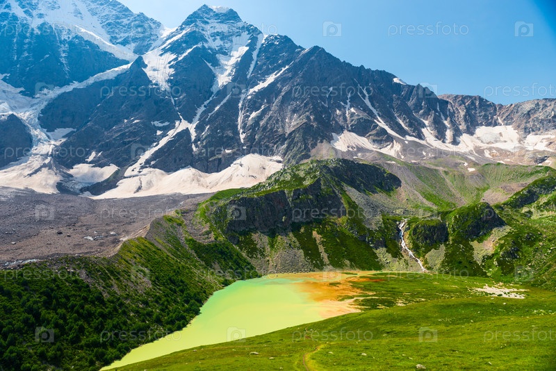 Красивый горный пейзаж с видом на ледник 'семь' и горное озеро.Кавказские горы