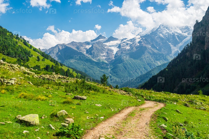 Красивый высокогорный пейзаж с пешеходной тропой, соснами и горной вершиной на заднем плане. Кавказ, Приэльбрусье