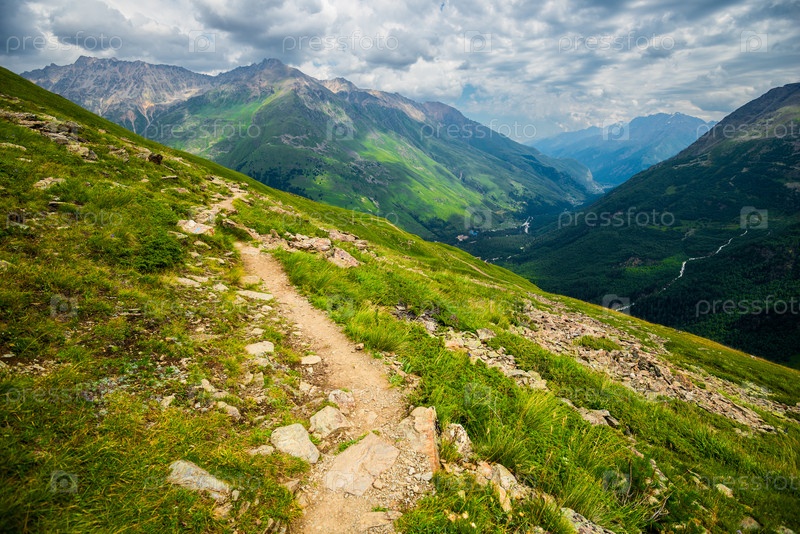 Красивый вид с пешеходной тропы на склоне горы высоко в Кавказских горах