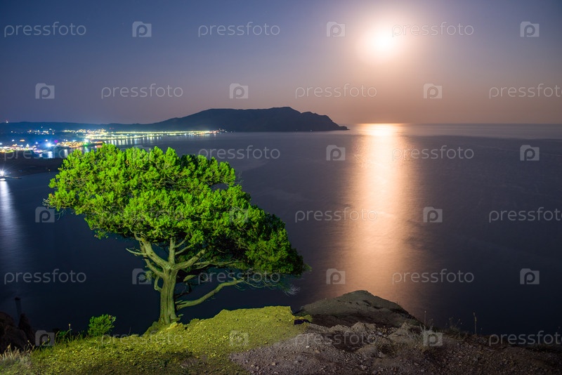 Ночной драматический морской пейзаж с деревом на фоне луны и лунной дорожкой в море. Крым. Россия