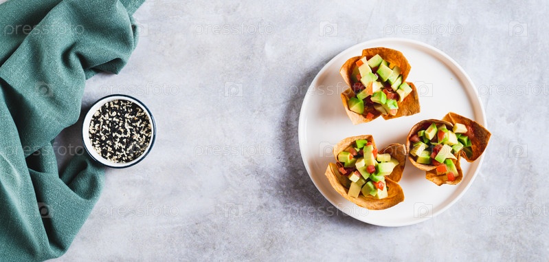 Мини-печеные питы в чашечках с гуакамоле на тарелке на столешнице веб-баннер