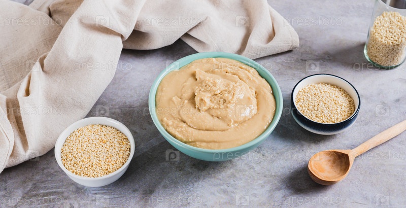 Кунжутная паста тахини в миске и семена кунжута в миске на столе веб-баннер