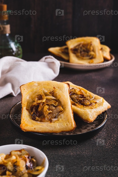Перевернутые тарты с карамелизированным луком на тарелке на столе вертикальный вид
