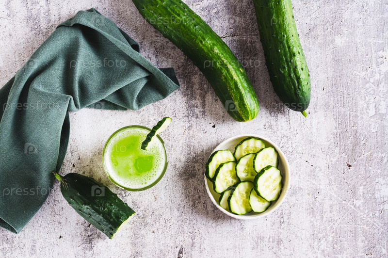 Свежий огуречный сок в стакане и кусочки огурца в миске на столешнице