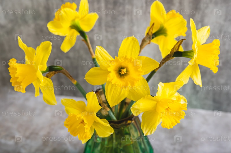 Крупный план свежих весенних цветов — желтых нарциссов в вазе на сером столе