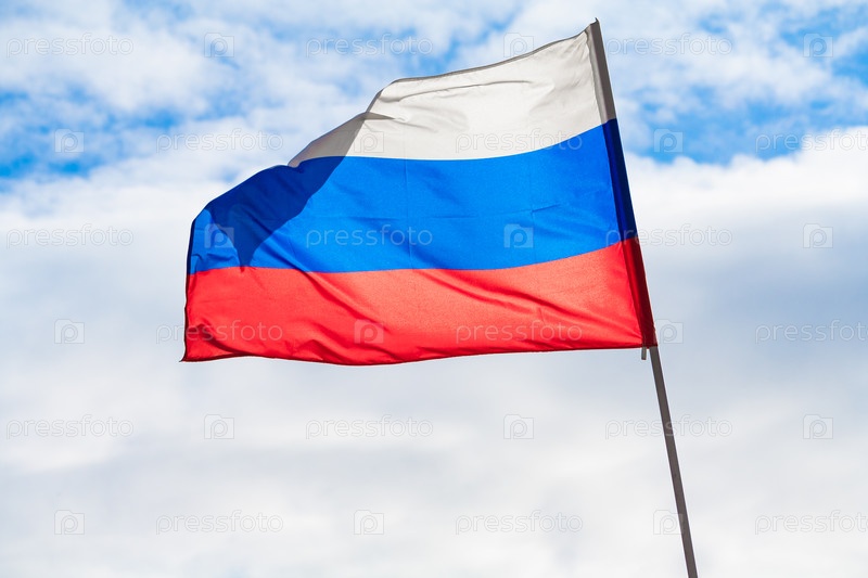 Флаг Российской Федерации развевается на ветру на фоне голубого неба и облаков