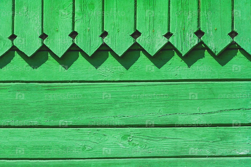 Окрашенные в зеленый цвет деревянные доски стены с орнаментальным фризом (текстура, фон)