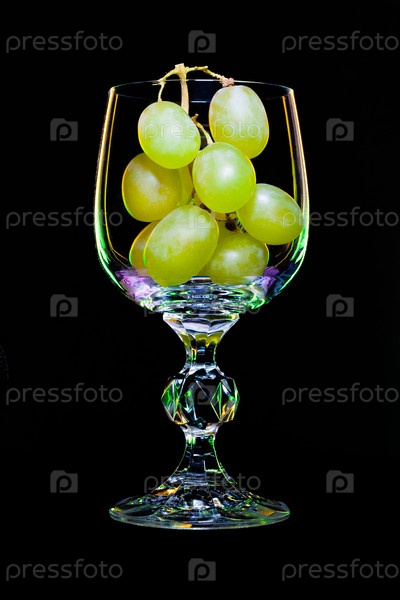 Бокал для вина, наполненный веткой винограда на черном фоне (концепция)
