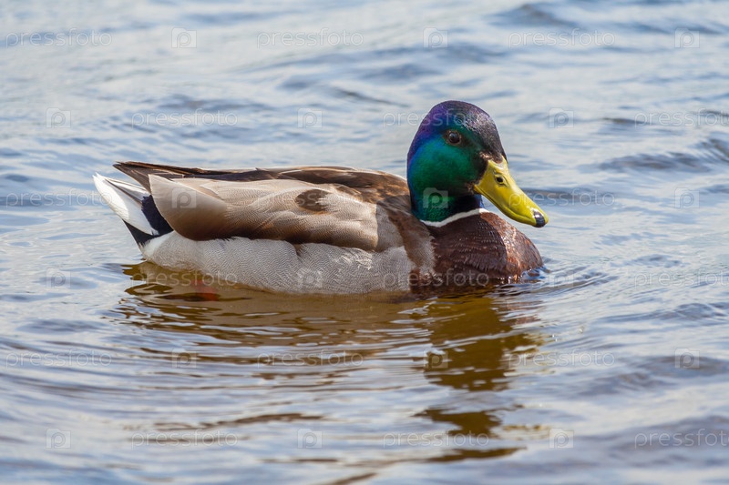 Селезень кряквы плывет по реке