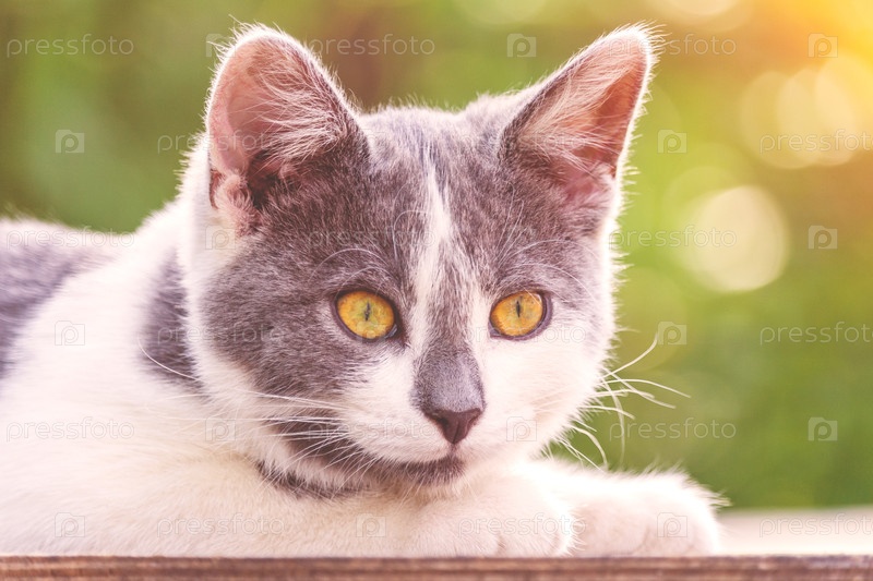Портрет серо-белого котенка с ярко-оранжевыми глазами, освещенный солнечным светом на фоне зеленых растений в эффекте боке (тонированный)
