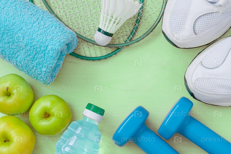 Атрибуты здорового образа жизни: еда, спорт или снаряжение спортсмена на ярком фоне. Вид сверху с копировальным пространством