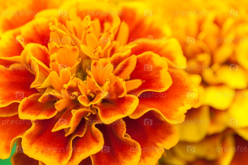 Оранжевые и желтые цветы бархатцев в саду (крупный план)