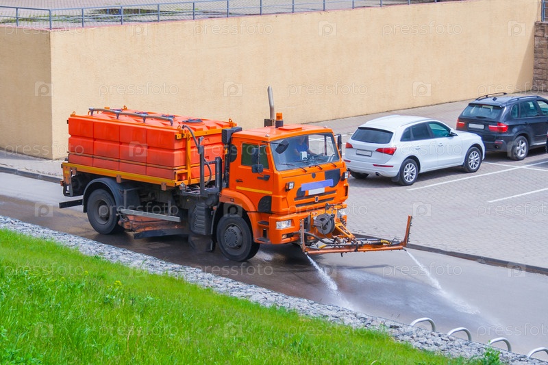 Поливальная машина оранжевого цвета смывает дорожную пыль и грязь