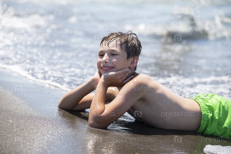 Счастливый мальчик отдыхает у моря, наслаждаясь волнами и летними каникулами. Ребенок на каникулах на берегу моря