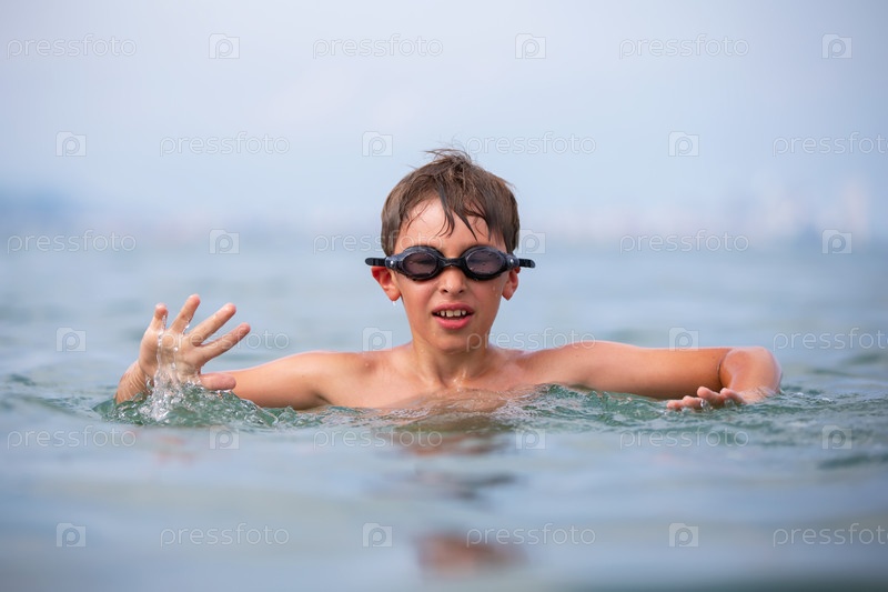 Мальчик в плавательных очках плавает в море