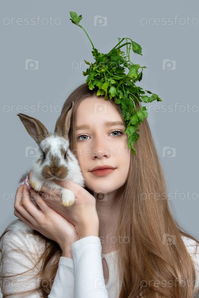 Сельская девочка с пучком петрушки на голове держит рябого кролика
