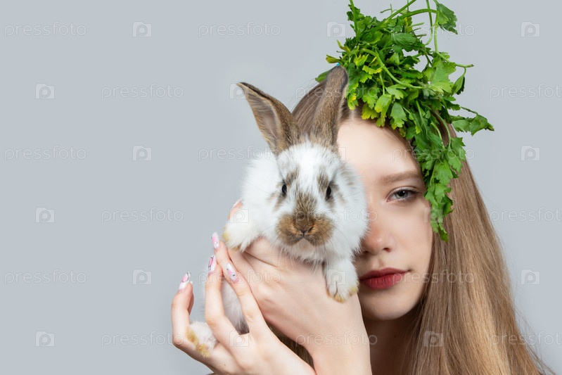На сером фоне крупным планом изображена сельская девочка с пучком петрушки на голове и маленьким кроликом