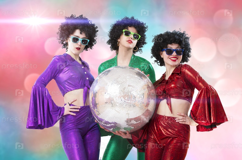 Группа веселых девушек держит диско-шар, вечеринка в честь Хэллоуина, на розовом фоне