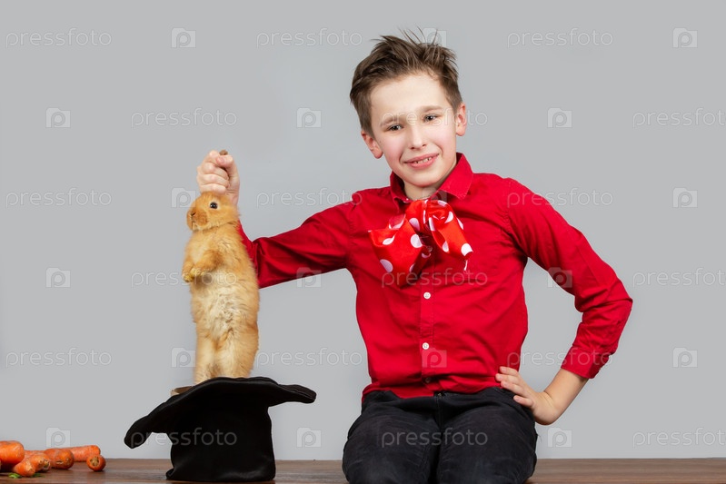 Мальчик-фокусник достает зайца из шляпы
