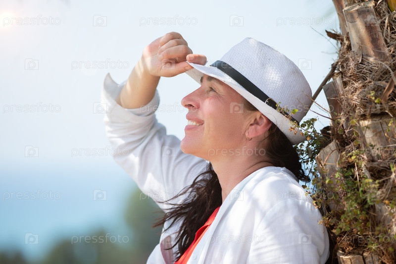 Профиль счастливой женщины возле тропической пальмы. Летние каникулы или отпуск для женщины среднего возраста