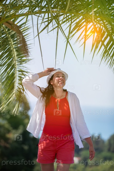 Счастливая женщина средних лет на фоне тропических пальм, освещенных ярким солнцем