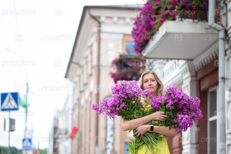 Красивая пожилая женщина с букетом цветов гуляет по городу. Возрастная модельная блондинка с голубыми глазами счастлива. Женщина пятидесяти лет гуляет летом, хорошо проводя время