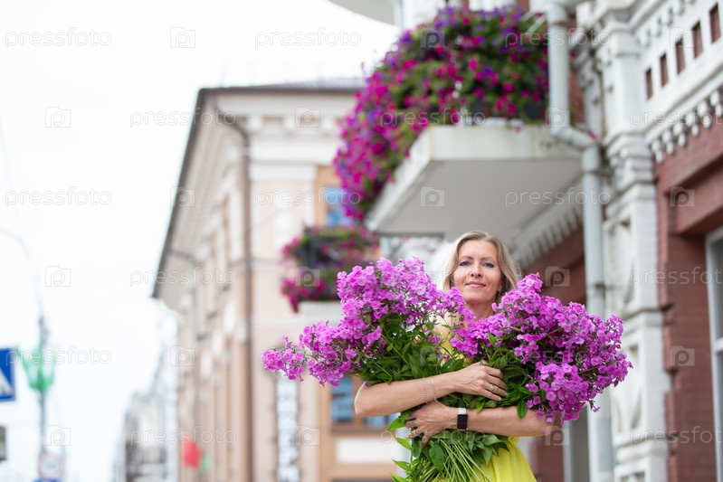 Красивая пожилая женщина с букетом цветов гуляет по городу. Возрастная модельная блондинка с голубыми глазами счастлива. Женщина пятидесяти лет гуляет летом, хорошо проводя время
