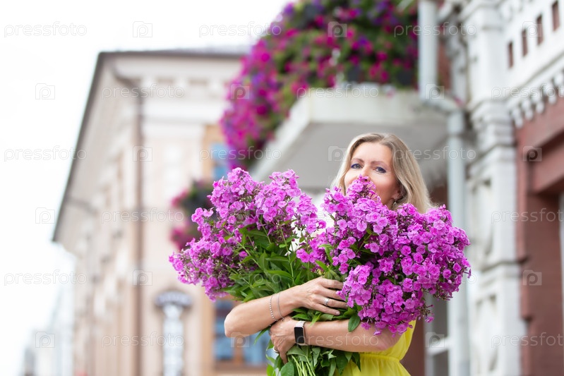 Красивая пожилая женщина с букетом цветов гуляет по городу. Возрастная модельная блондинка с голубыми глазами счастлива. Женщина пятидесяти лет гуляет летом, хорошо проводя время